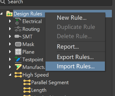 4. 打開一個需要導入規則的PCB文件,打開PCB規則及約束編輯器,在左邊規則項區域內右擊,執行Import Rules