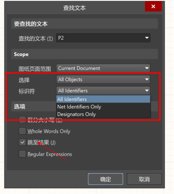 這里就需要對查找的設置做一下改變,如下圖所示,在“選擇”下拉框中選定”All Objects”,這樣就不用選定任何對象即可在當前原理圖中進行查找。在“標識符”下拉框中可以選擇查找所有標識符、網絡標識符、僅位號,再將“跳至結果”勾上,會自動跳轉到查找到的對象。這樣再去進行查找,就可以找到所需對象。