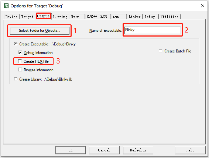 在上圖中3的位置,勾選前面復(fù)選框,來創(chuàng)建可執(zhí)行HEX文件。