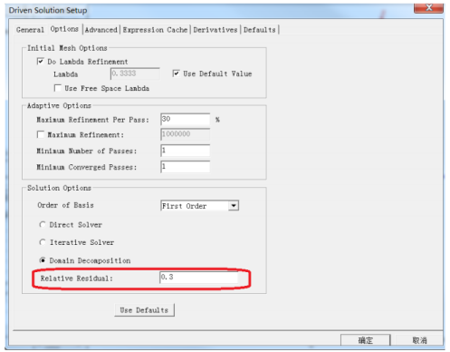 不能。迭代求解的誤差設(shè)置是為了保證迭代算法的收斂,而這個(gè)誤差也會(huì)對(duì) S 參數(shù)的收斂產(chǎn)生影響,HFSS 默認(rèn)會(huì)把這個(gè)值設(shè)置為 0.0001。這個(gè)值最大為 0.1,如果超過(guò)0.1會(huì)報(bào)錯(cuò)。