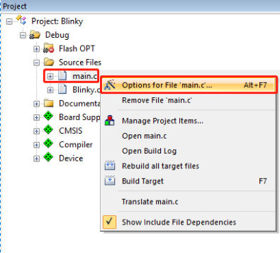 首先在項目工程列表內(nèi)選擇要查看的文件,例如main文件,點擊右鍵選擇Options for file‘main.c’...圖標(biāo).