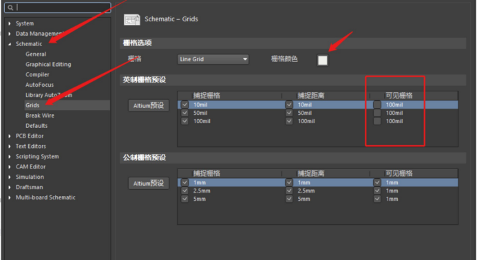 點擊“Schematic”->"Grids".如果只想去掉柵格,可以直接將紅框框中的三個選項框取消勾選。如果還想設置為別的顏色背景,就選擇柵格顏色就行。