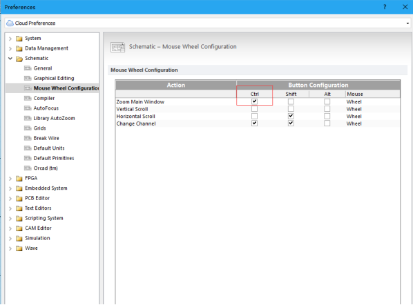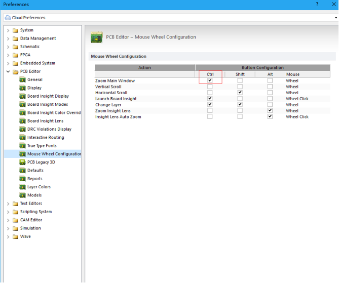 Altium安裝后,要對原理圖或者PCB進行放大或者縮小,默認是Ctrl鍵+鼠標滾輪,但可以設置成只有鼠標滾輪進行放大縮小,如下