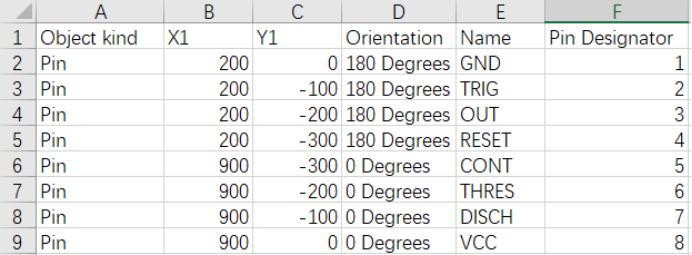| Object kind | X1 | Y1 | Orientation | Name | Pin Designator |