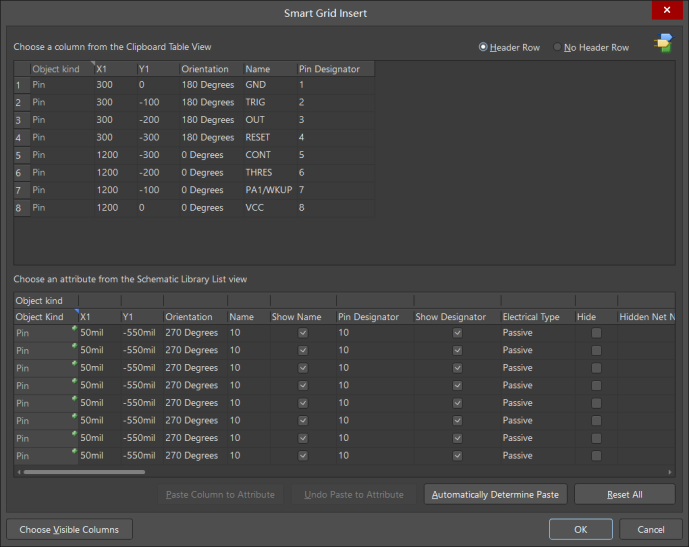 5.在彈出的對話框中,分為兩個部分,上面的信息是從 Excel 中復制的信息,下面的表格是將要制作原理圖符號的信息,單擊Automatically Determine Paste 按鈕,將上面的信息自動復制并粘貼到下面的表格中。