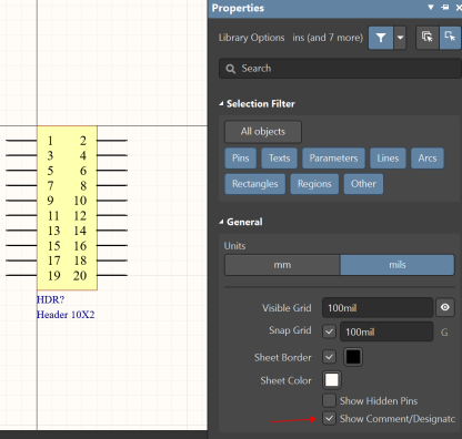 1. 在原理圖符號編輯界面下打開屬性或者運行“工具”——“文檔選項”,把show Comment/Designator勾上,這樣就可以把這兩項顯示出來。