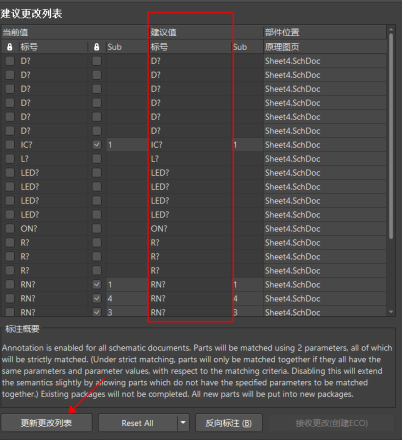 在窗口的右側,有一個建議更改列表,能夠看到目標原理圖中所有元器件標號情況。