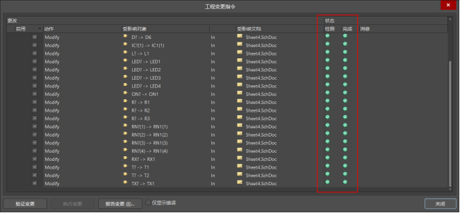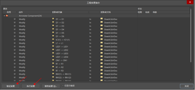 彈出工程變更指令窗口,先后點擊“驗證變更”、“執行變更”兩個指令。
