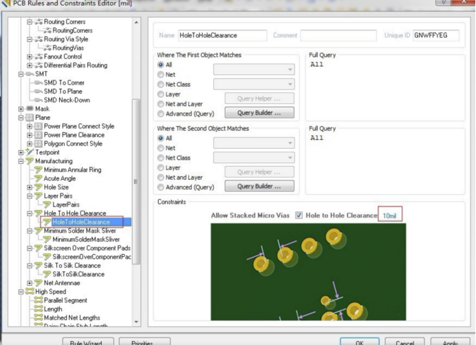 manufacturing>hole to hole clearance,把這個值設(shè)置的小一點,如圖10mil