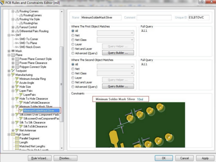 Minimum Solder Mask Sliver設(shè)置的小一點,如圖10mil