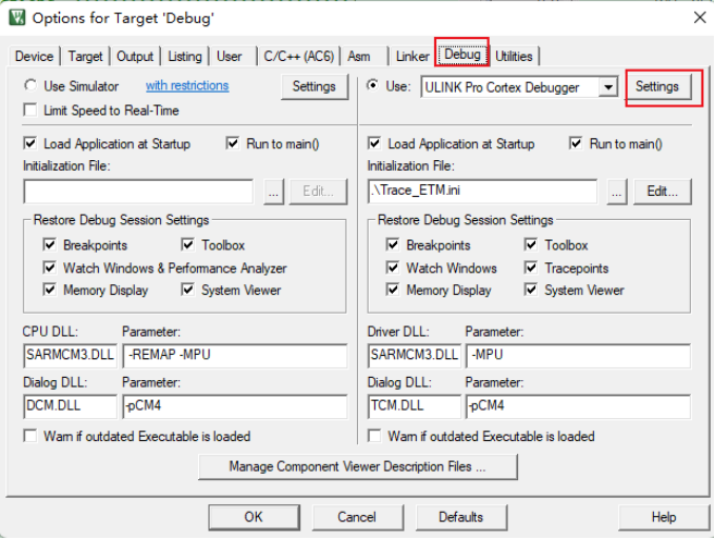 通過點(diǎn)擊options for target,選擇debug欄,點(diǎn)擊settings進(jìn)入到設(shè)置欄中。
