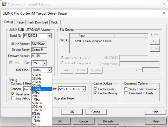 然后通過選擇Max Clock調(diào)整下載速度,注意這里最高的速度為50MHZ,但是可使用的最高下載速度是根據(jù)下載器所支持的最高下載速度來設(shè)定,超過下載器所支持的最高下載速度是無法使用的。