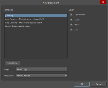 彈出New Document對話框,在該對話框中可以選擇預定義的文檔模板(安裝時提供三個)或創建空白A4文檔的[Default]選項,新建的Draftsman Document文件后級為.PcbDoc且默認存放在工程文件路徑下。