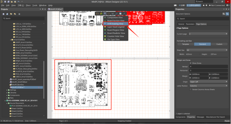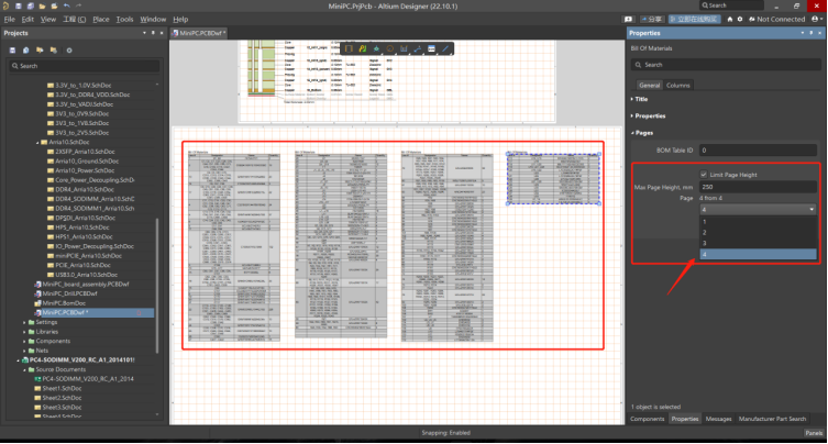 放置物料清單(BOM)后,可以看到物料數量多而無法全部顯示,雙擊打開屬性面板后,勾選Limit Page Height,設置長度“250”,復制后依次選擇頁數。