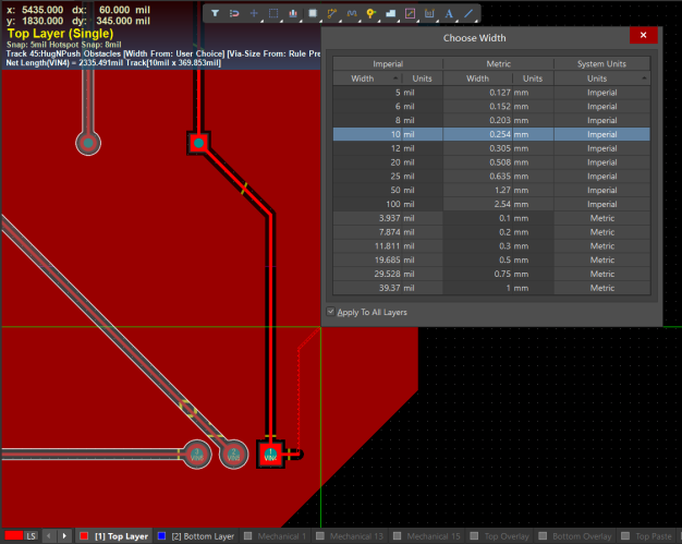 可以查看到預設的布線寬度,英制和公制相對應,可以更好的使用所需要的布線寬度。可以添加需要的線寬預設。