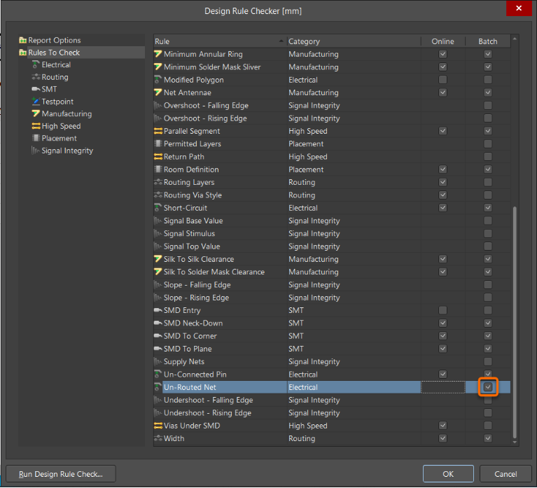 1. 進入菜單Tools ??Design Rule Check,選擇左側窗格中的選項卡"Rules To Check",然后選中底部的“Un-Routed Net”規則,并啟用"Batch"復選框。單擊左下角的按鈕“Run Design Rule Check...”。請注意,Batch選項不適用于在線實時規則檢查Online DRC。運行DRC后,錯誤標記將顯示在PCB上。你可以使用Tools ??Reset Error Markers 以刪除這些標記。