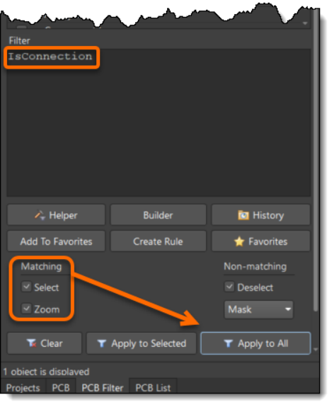 3.打開PCB Filter面板,在Filter區域鍵入IsConnection語句,點擊按鈕“Apply to All”,將顯示PCB上所有的架空線(連接線)。