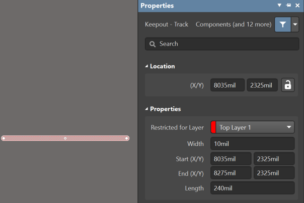 對于Keepout線,層的設(shè)置將決定該線對哪些層有效。通過層設(shè)置可以將Keepout線設(shè)置為Keep-Out層和當(dāng)前PCB疊層結(jié)構(gòu)中其他的布線層,并且顏色會變成對應(yīng)層的顏色。如果設(shè)置在Keep-Out層,此線對所有布線層有效;如果設(shè)置為某一層(如Top),則只對當(dāng)前層有效。