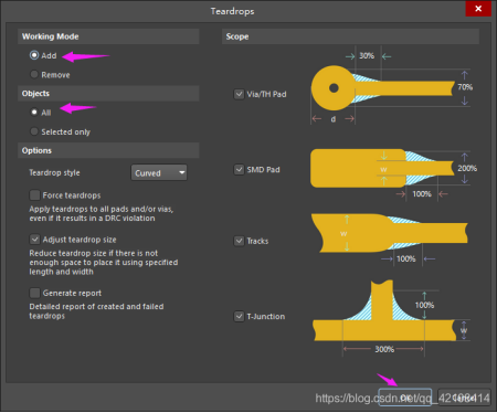 選擇Add,和All,最后點擊OK,再稍等會,我們會發現我們的焊盤附近就冒出“淚滴”一樣的銅~