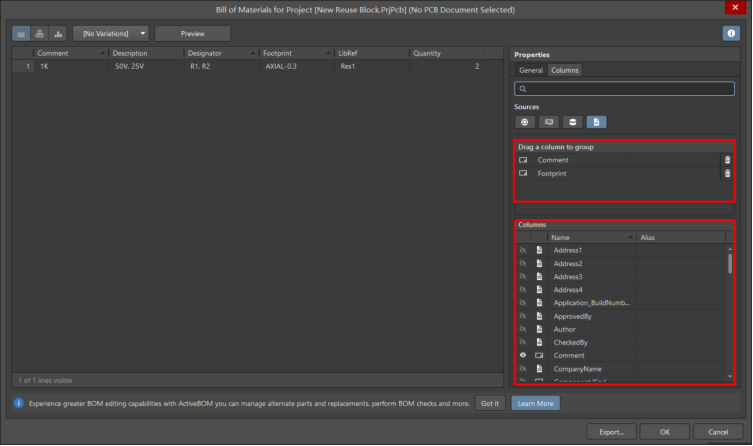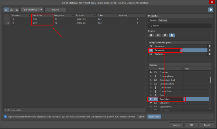 拖入后,可以看到左側(cè)的信息欄中已經(jīng)將Description作為篩選條件,將元器件進行分組顯示。