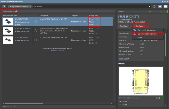 在【Search】搜索框中輸入STM32C8T6添加篩選條件,【Supply Info】信息欄下有價格和庫存等信息。