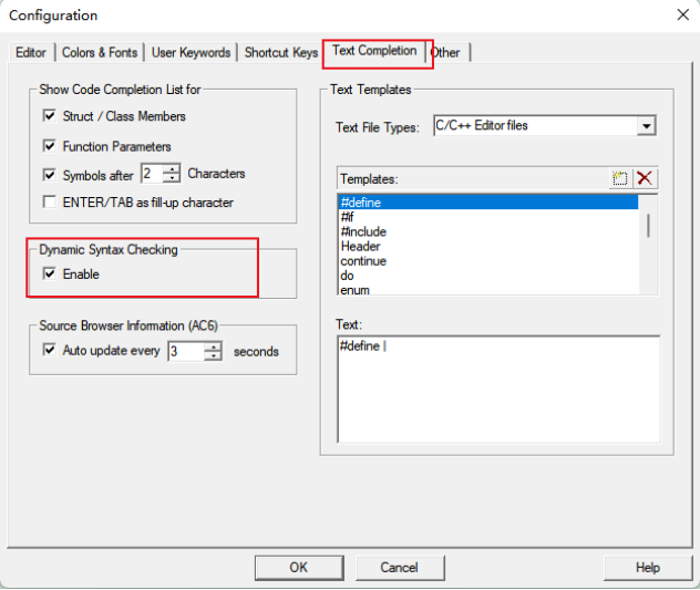 在Keil MDK中,可以在configuration->Text Completion中,在Dynamic Syntax Checking中將Enable勾選上,那么在編輯代碼的時候就會動態檢測語法錯誤了。