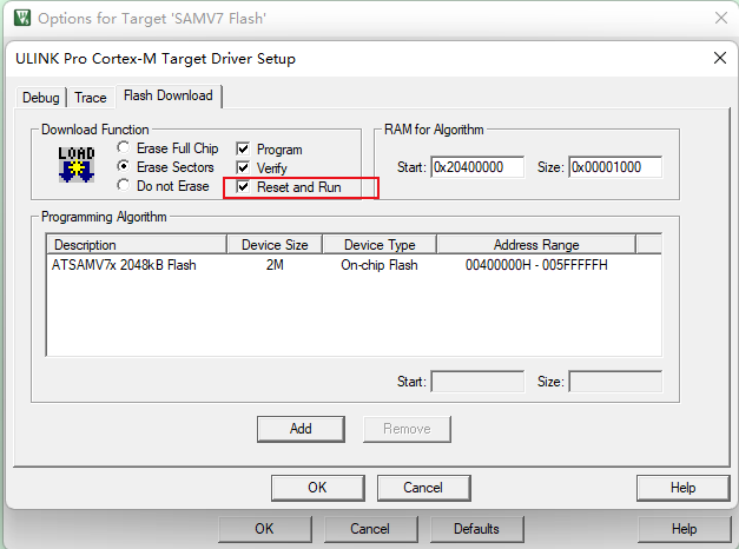 在下載程序后,若出現需要手動的對于板子進行復位才能運行程序的情況。需要將仿真器設置中的Flash Download中將Reset and Run勾選上,就不會出現需要手動復位的情況了。