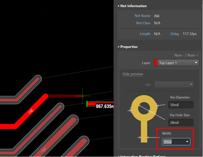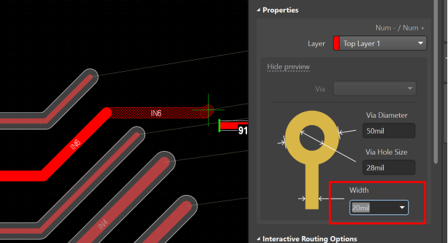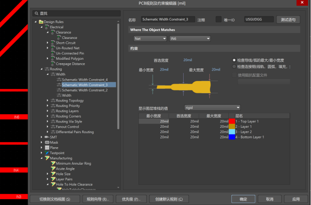 以下圖為例,網絡IN6在規則中設置了20mil的線寬,此時對該網絡布線,線寬默認為20mil。