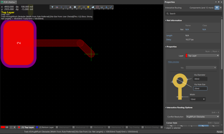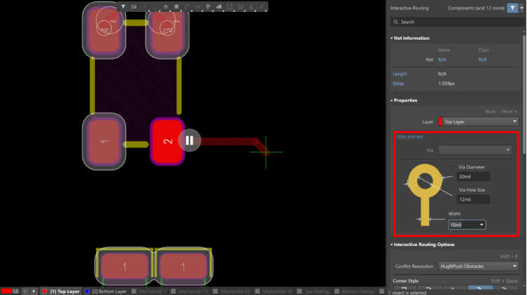 再次走線時就會出現(xiàn),上次調(diào)整的過孔數(shù)值。