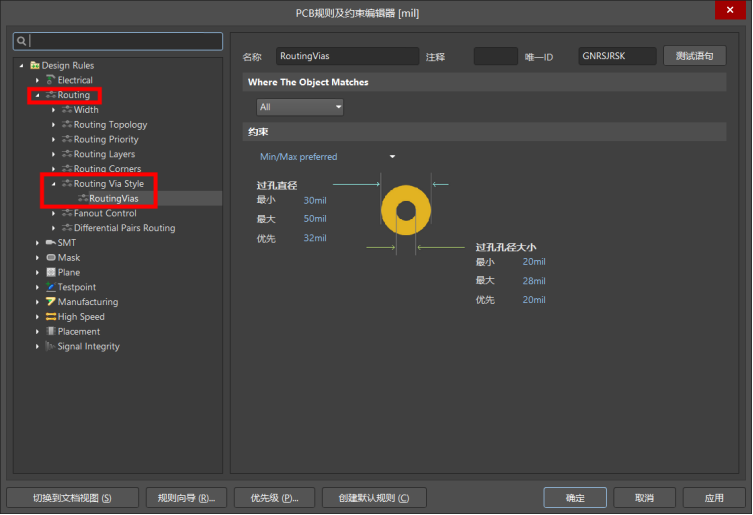 彈出【PCB規(guī)則及約束器】對話框,打開【Routing】【Routing Via Style】走線過孔設(shè)置菜單。