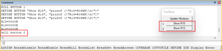 應用場景:在調試過程中,想自定義一些調試功能或者對于多種的調試命令想一鍵執行,可以通過下面的功能進行設置自定義調試按鈕。工具箱按鈕可以在任何時候單擊,甚至在運行測試程序時也可以單擊。