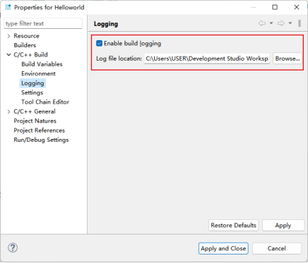 2、在屬性窗口中,展開“C/ c++ Build”,選擇“Logging”。在Logging中可以看到有一個Enable build logging的選項,勾選上就會在Build后會自動生成build log文件。在下面還可以指定log文件的存儲路徑。