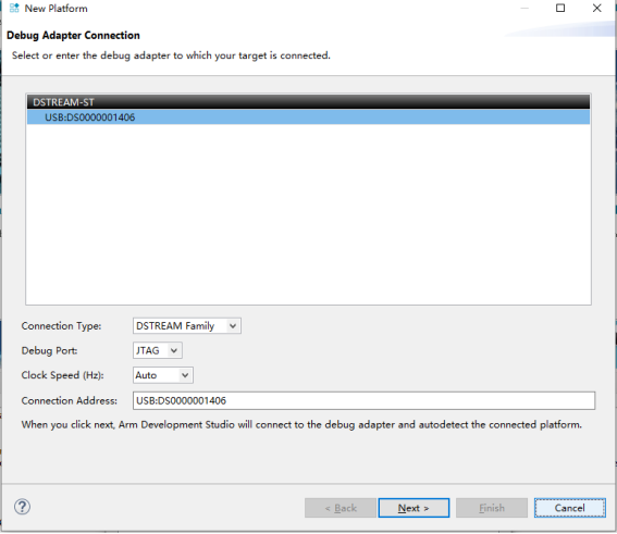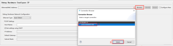 3 在Debug Hardware Configure IP界面點擊“Browse…”,在彈出的界面點擊DSTREAM的編號,然后點擊“Select”