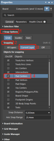 3 在Properties界面中展開“Snap Options”選項,在“Snapping”標簽下選擇“Current Layer”或者“ALL Layers”;并在Objects for?snapping中勾選“Pad Centers”